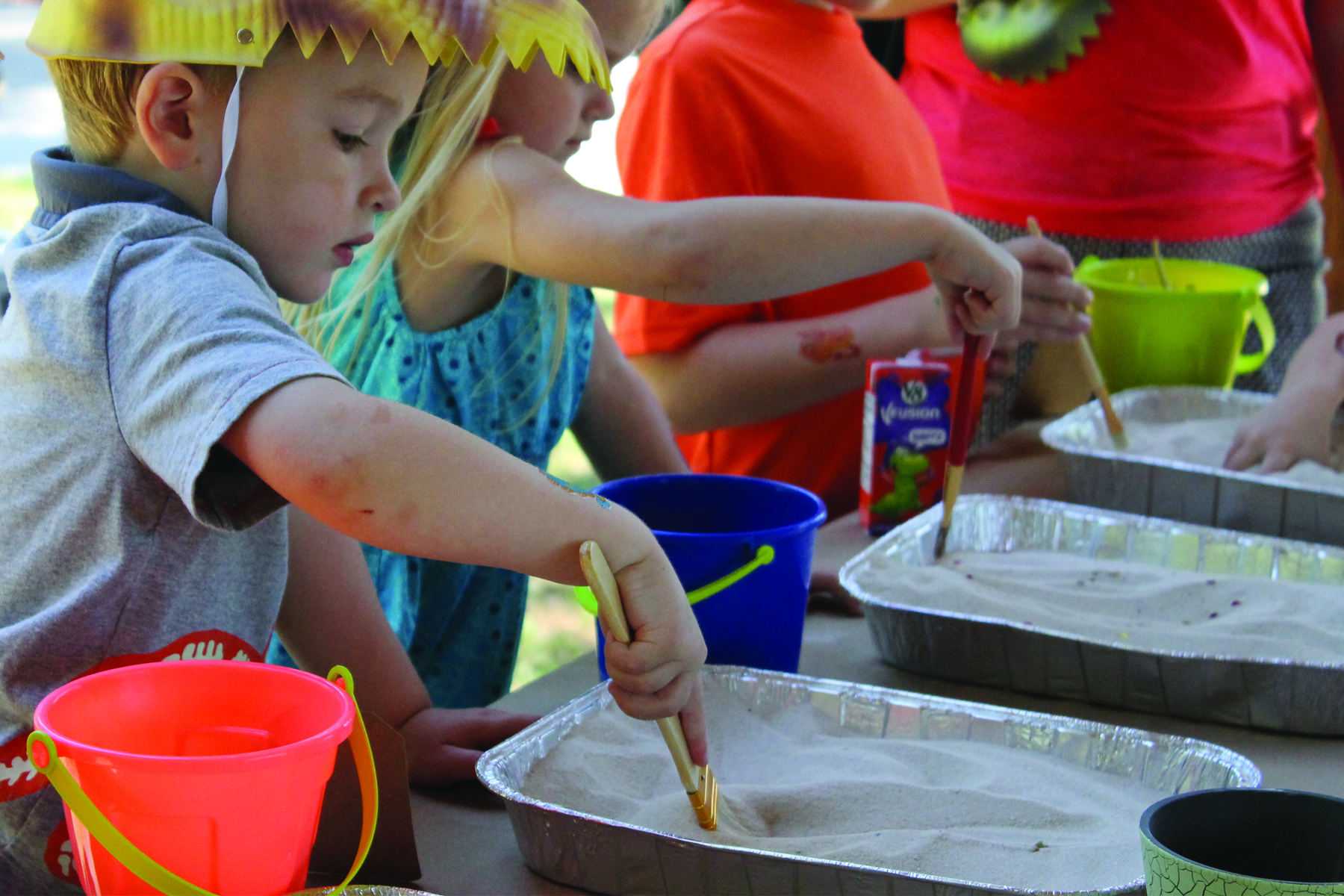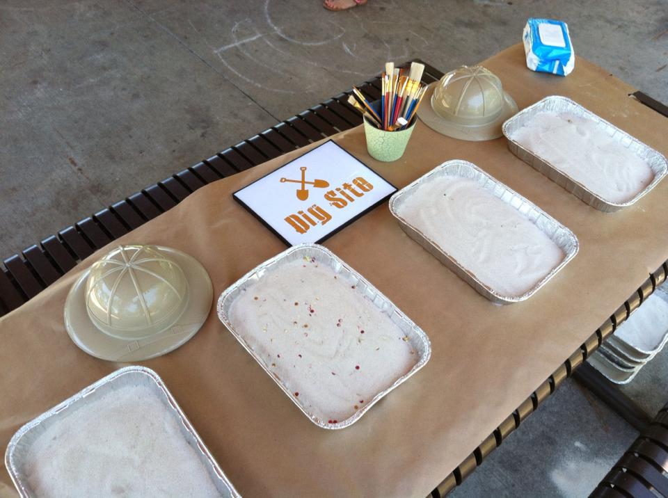 The next item on the ‘ol trusty schedule was activity #2, so we gathered at The Dig Site. This activity was the kids’ favorite and I wish I’d gone with deeper tins. They were content for a solid half hour (yay, schedule!) to comb through the sand with tiny paintbrushes, committed to finding each buried treasure. We’d hidden these dino skeletons and shiny confetti in the play sand and they kept every piece they found in their buckets.