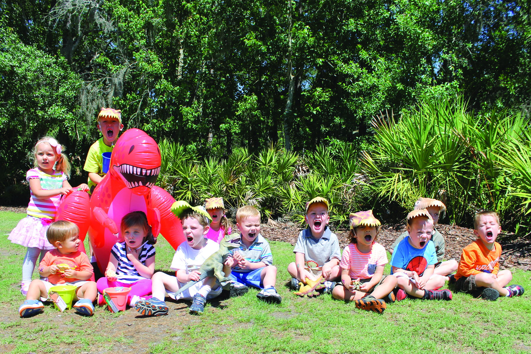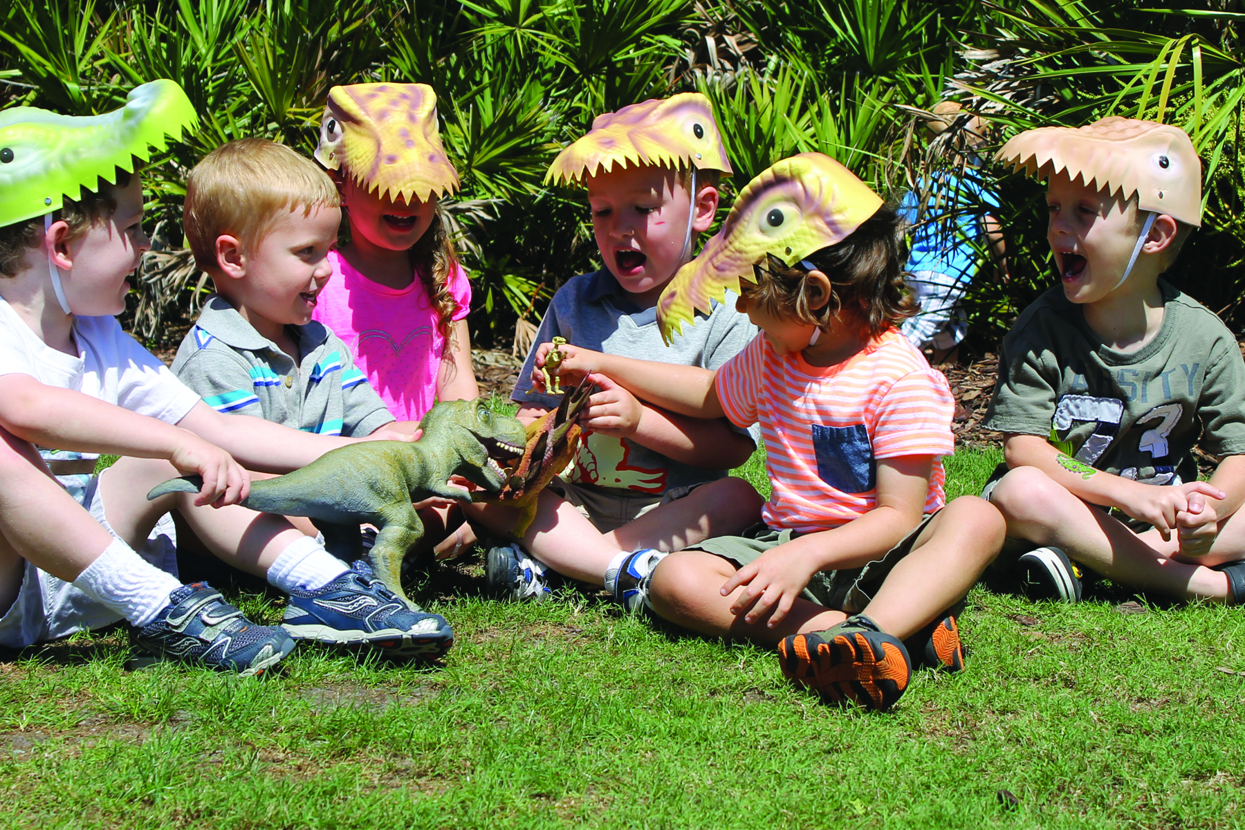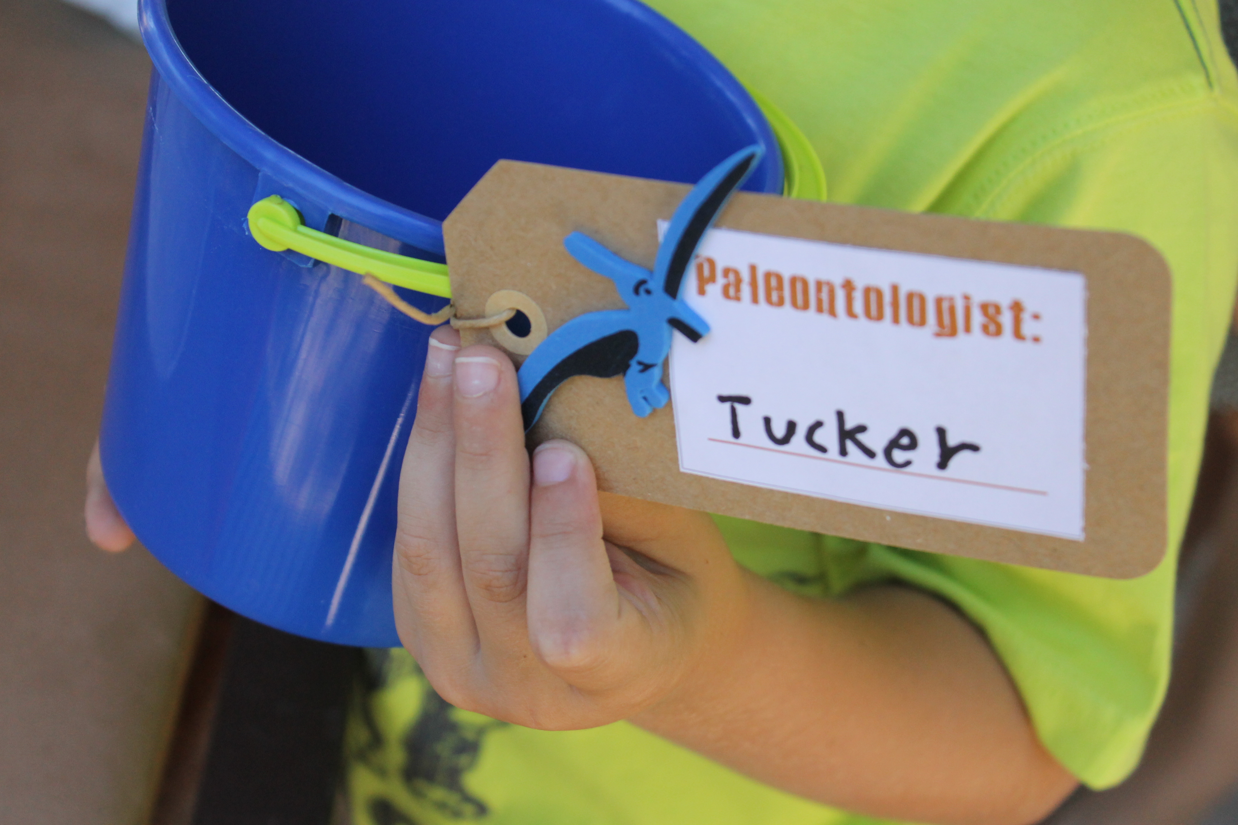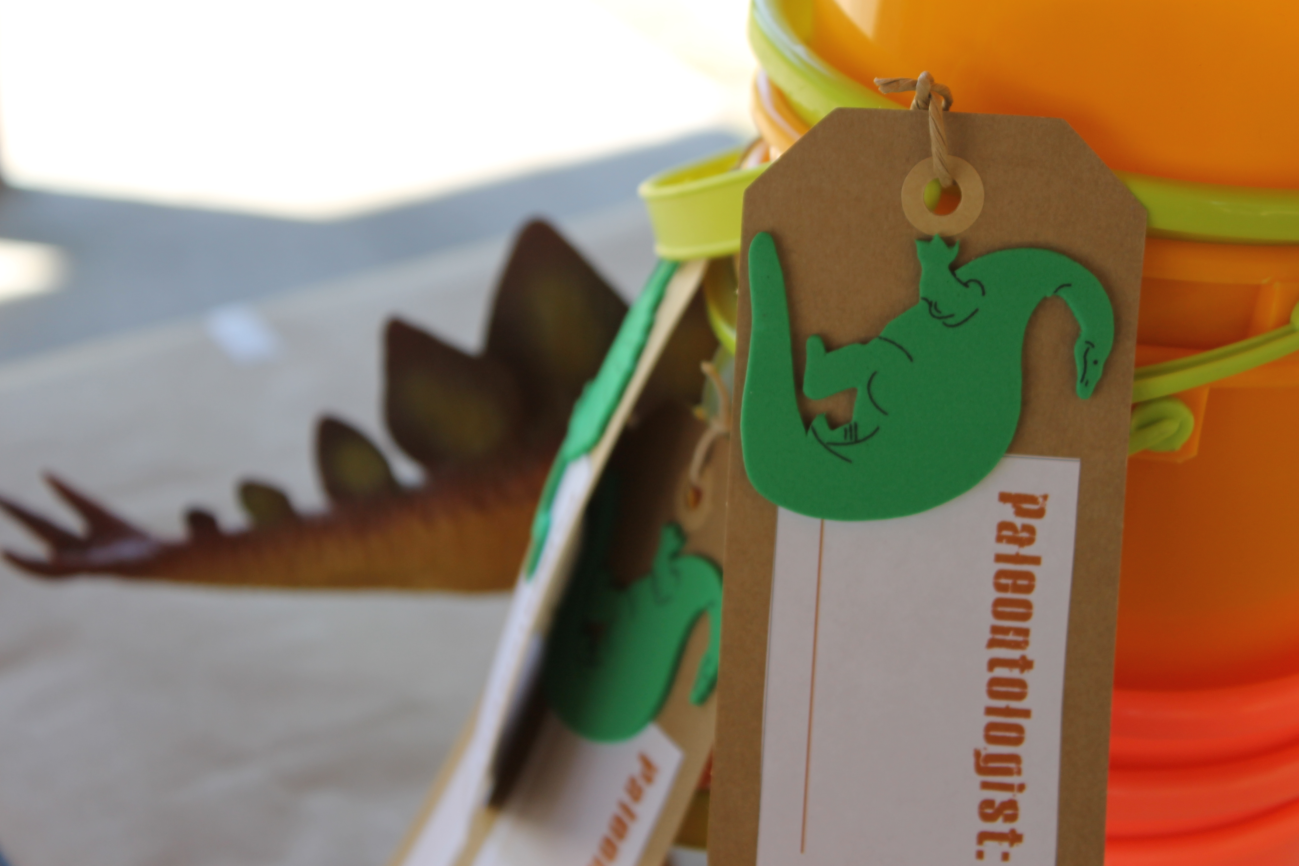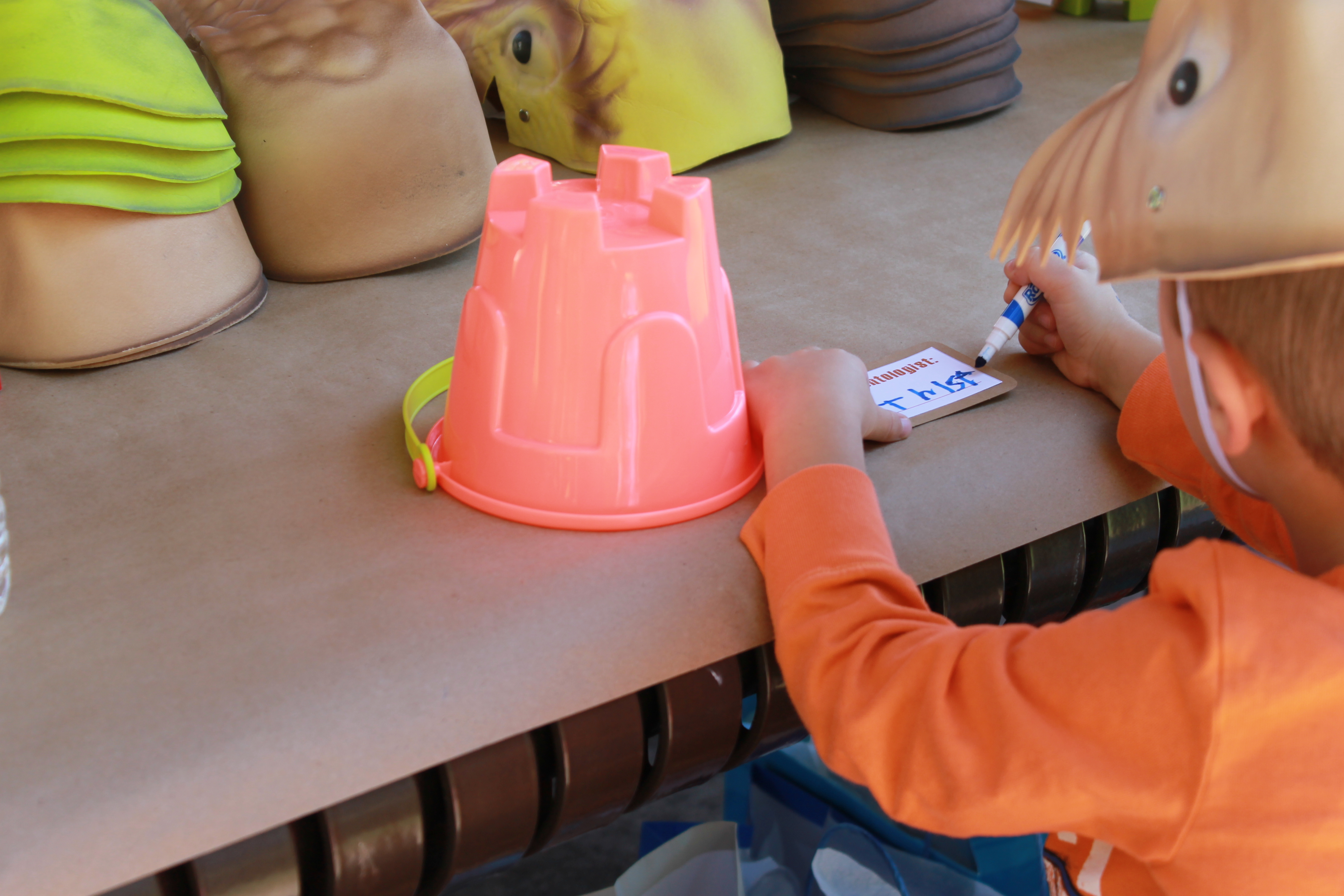 Now, official paleontologists, they claimed their tools by writing their names on their bucket tags. Then, it was off to the Dinosaur Egg Hunt. I found these awesome eggs with a fun texture and a great prize inside. We were scheduled to be in full force egg hunt fun for at least a half hour. These super sleuthy kids found all the eggs in a matter of minutes—like, less than 5—and stashed them in their buckets.
