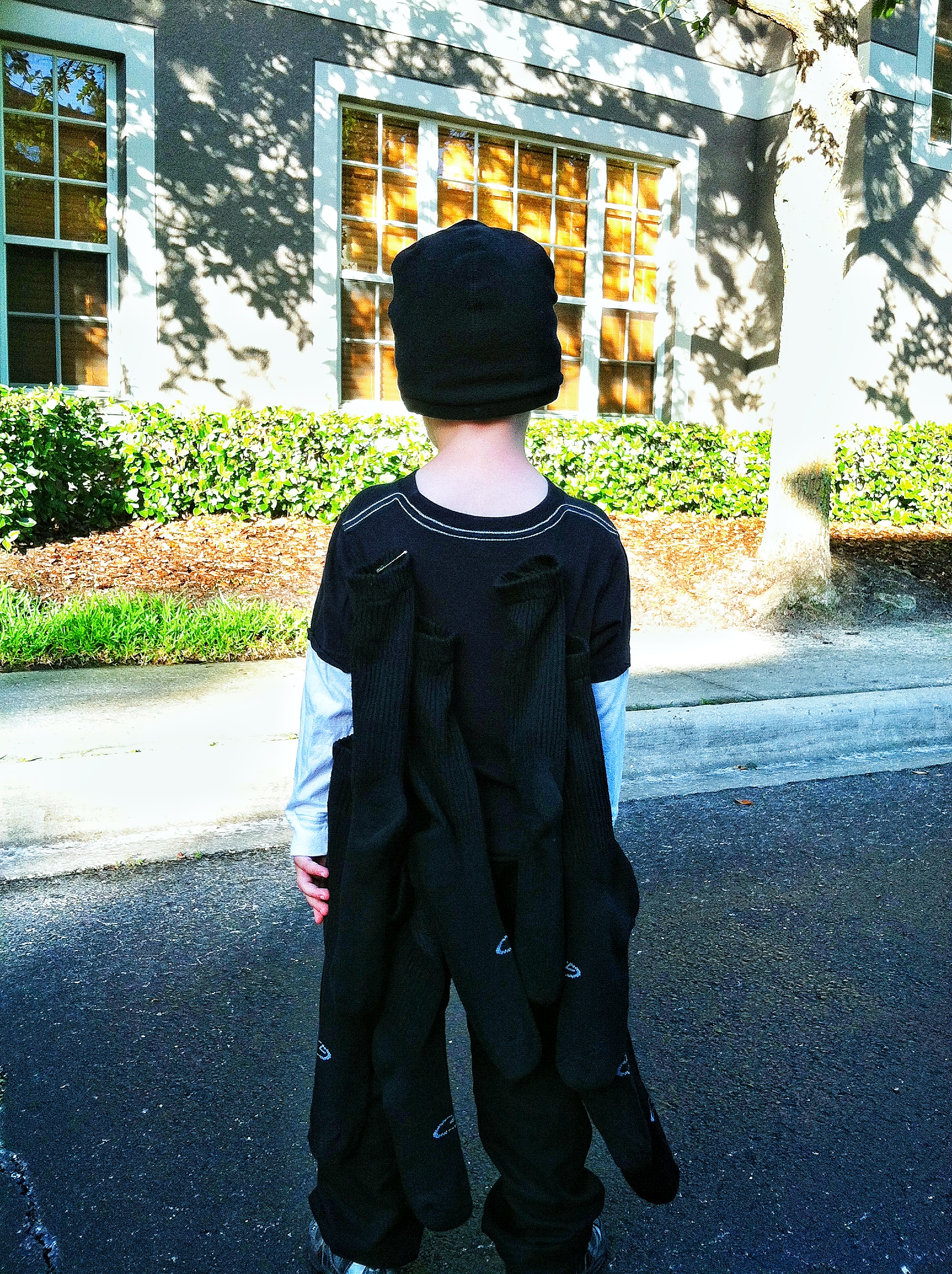 So, for a bug day with boys, you get some long, black socks and rifle through the closet for a cool shirt. Dad digs his beanie out of the winter drawer. And you make a spider.