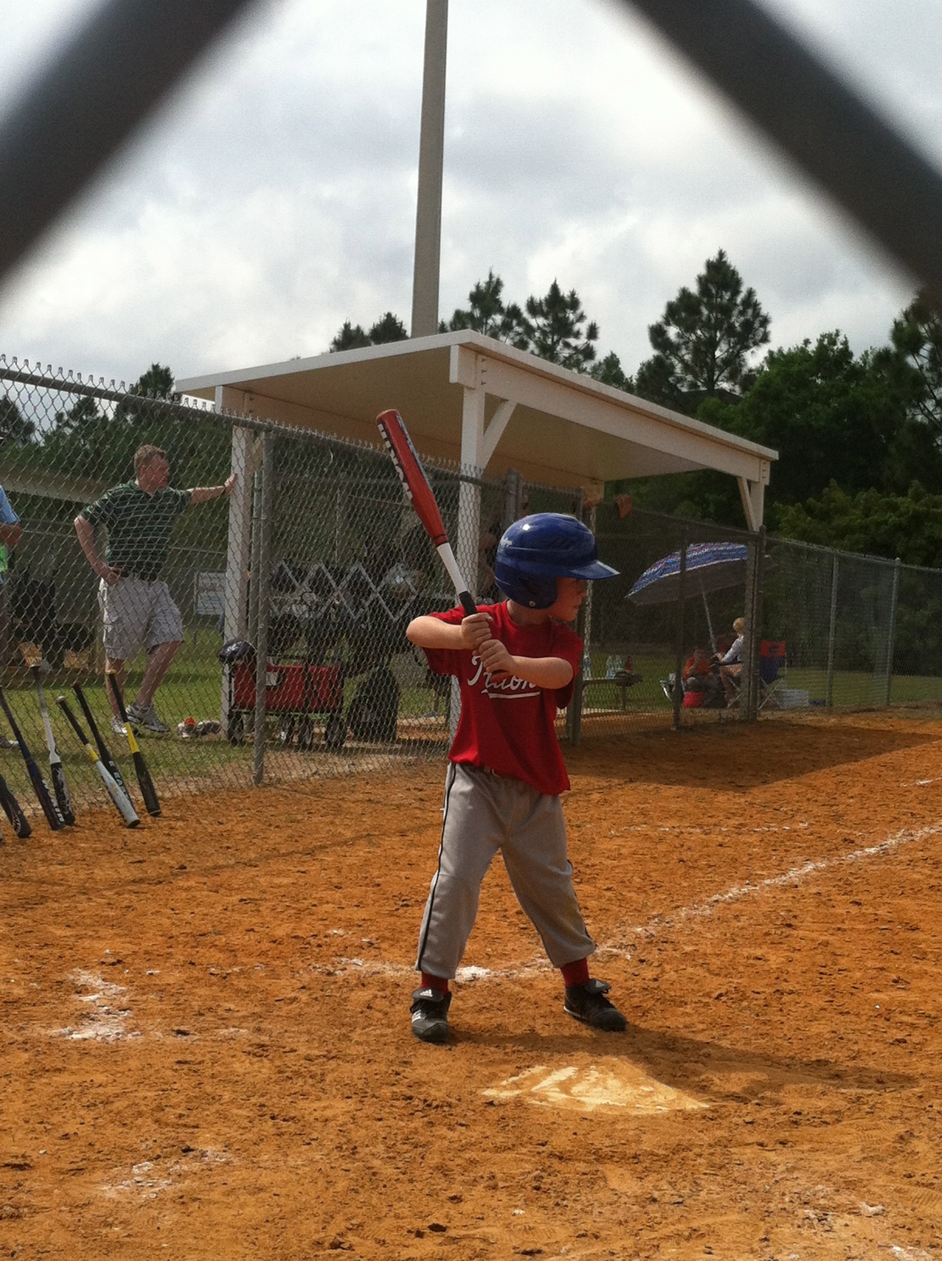 Case shared a spot in the shade with me while Jeff helped coach on the field. But games are long for a baby brother who just wants a team of his own. So, sometimes he would sneak beneath the bleachers and watch from the fence.