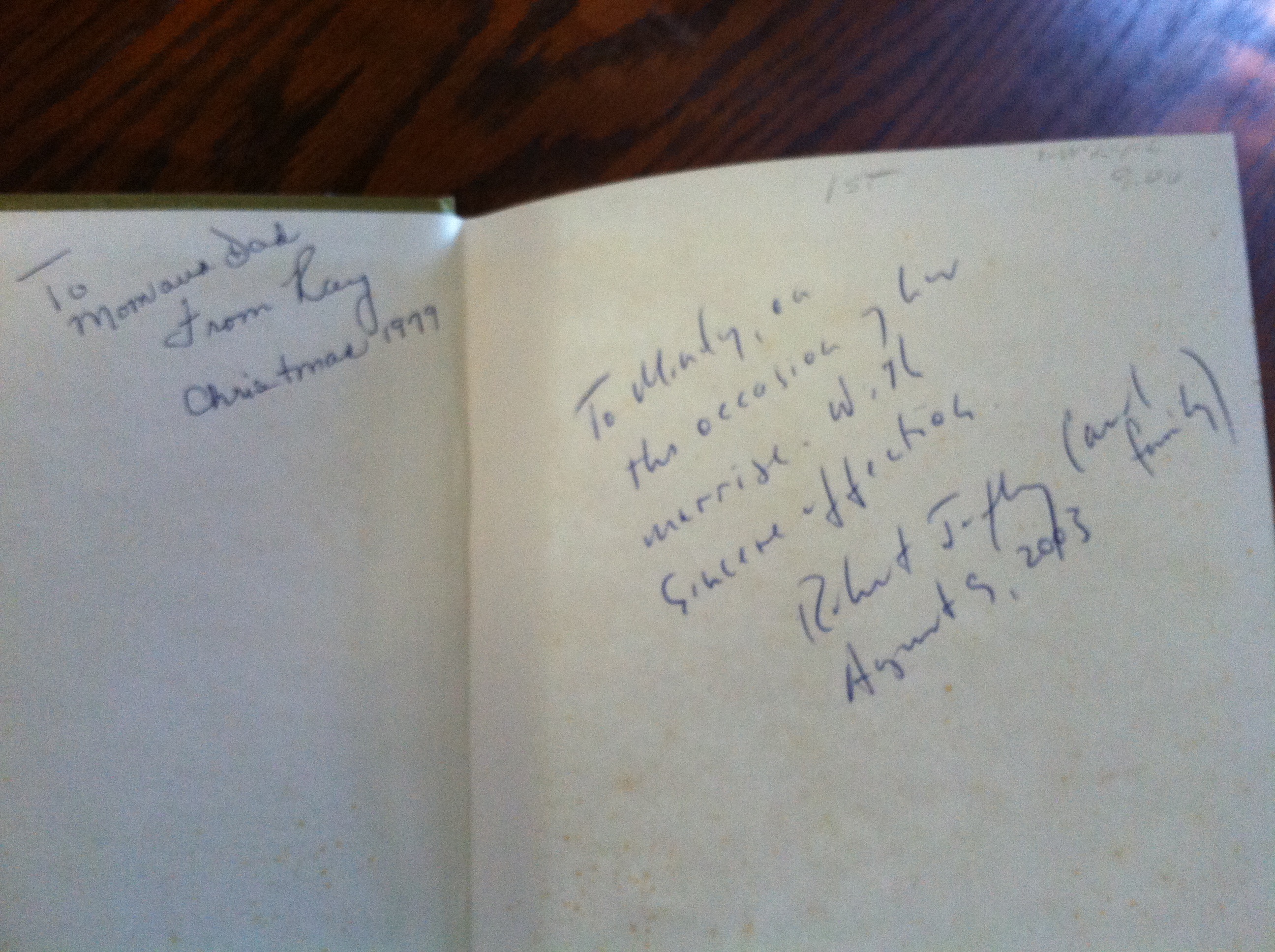 I always like to find a secondhand, love-worn book. I especially geek out over a hardback with a slippery, crinkly dust jacket. My favorites are marked with double or triple inscriptions. Like this one.