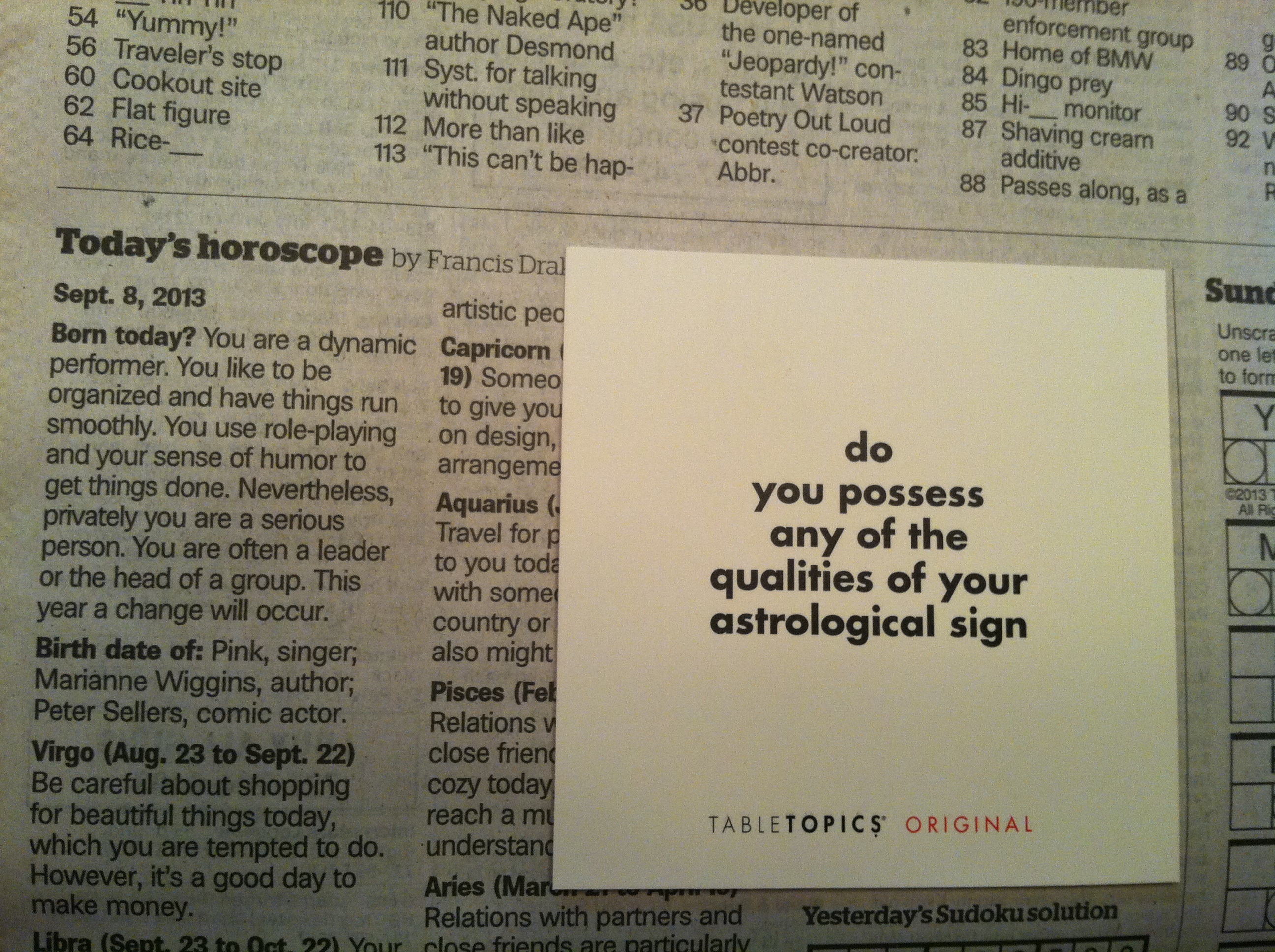 If ever a Table Topic question was designed just for me, this would be it. I’m fascinated by astrological signs. Well, I guess that’s not completely true. I’m completely fascinated with my astrological sign, and I suppose it’s because I identify with it so much. Every quality it lists is a quality I feel I possess and demonstrate on a regular basis. Whomever determined the traits of this particular zodiac sign must’ve had me in mind…and I truly believe that (even though I know these were created way before I graced this Earth with my presence).